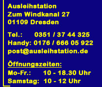 Sie erreichen uns telefonisch unter 0351 / 37 44 32 5 / per E-mail: post(at)ausleihstation.de